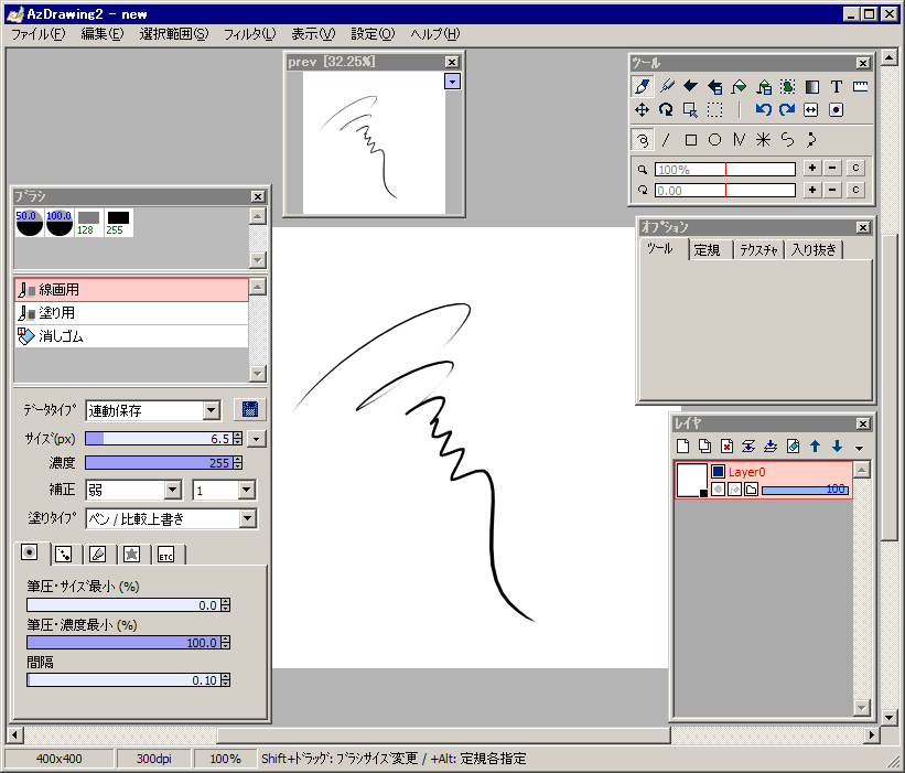 動作も軽快でペンが遅れて着いてくることもありません。強制終了もほぼ無く、今まで重いツールを使っていたけれどAzPainter2に出会ってびっくりする方も多いと思います。